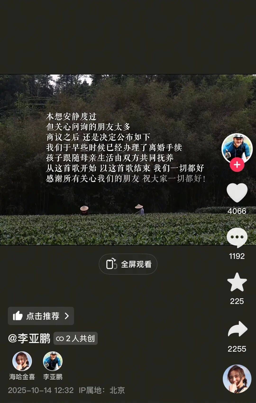 根据公开资料,李亚鹏和海哈金喜在2020年官宣恋情,2022年结婚、女儿李夏出生。在两人官宣离婚的视频中,李亚鹏表示,两人在早些时候已办理离婚手续,孩子随母亲生活,由双方抚养。五个月前,海哈金喜还曾在镜头前澄清离婚传闻,“春节之后,鹏哥一直上山下乡给大家找好的茶叶,两个人很久没在一起了。”